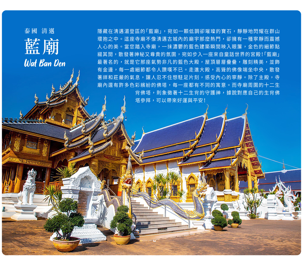 【清萊藍廟】建於2005年,直到2016年初才建成完工。是由白廟主人許龍才先生的 徒弟「PhutthaKarbkaew 」所設計建造的,想延續了他的師父修建「白廟」的初衷理念,而且也是泰國寺廟藝術色調設計上的一大突破,雖然面積僅僅只有9600平方公尺,但卻是是近期泰國非常具藝術性跟代表性的佛教寺廟。