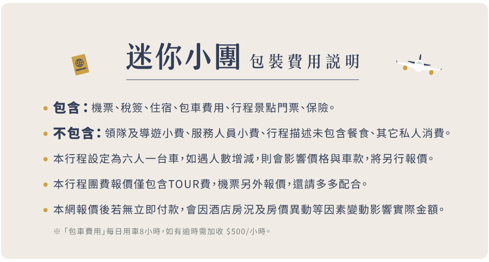 ♦不含:往返機票費用、稅金、司機導遊小費。