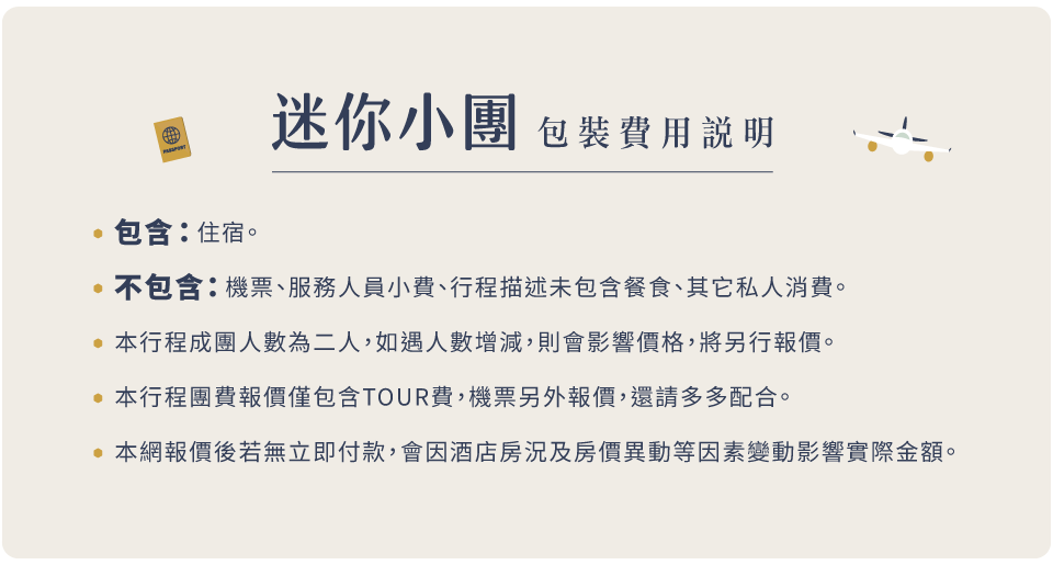 不含項目:不含小費、來回機票