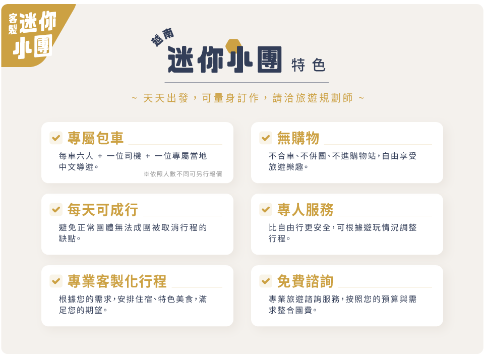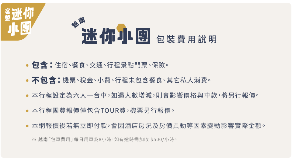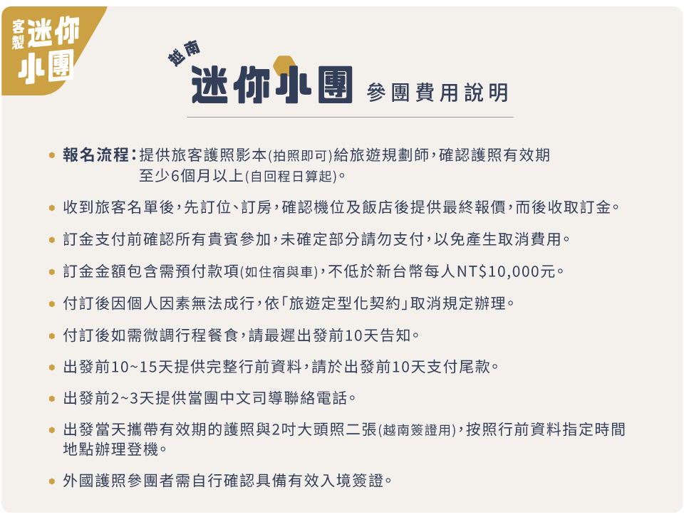 5. 本優惠行程僅適用本國人(持中華民國護照)於台灣出發同行參團有效,越南當地人士、或越南出生(含越南新娘)、或越南工作、或設廠台商、或越南當地JOIN者,不接受參團,另外其他非本國籍人士(外籍人士)需另加價。