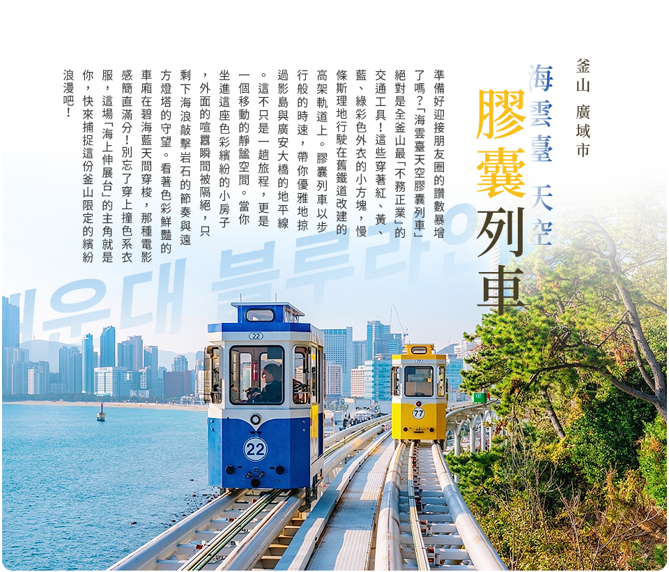 釜山超人氣體驗,沿著海岸線慢慢前行,搭配遼闊海景與療癒海風,是最具釜山特色的打卡行程。坐在透明車窗旁欣賞海天一線,隨手拍都是明信片等級,絕對是釜山旅程的亮點之一。