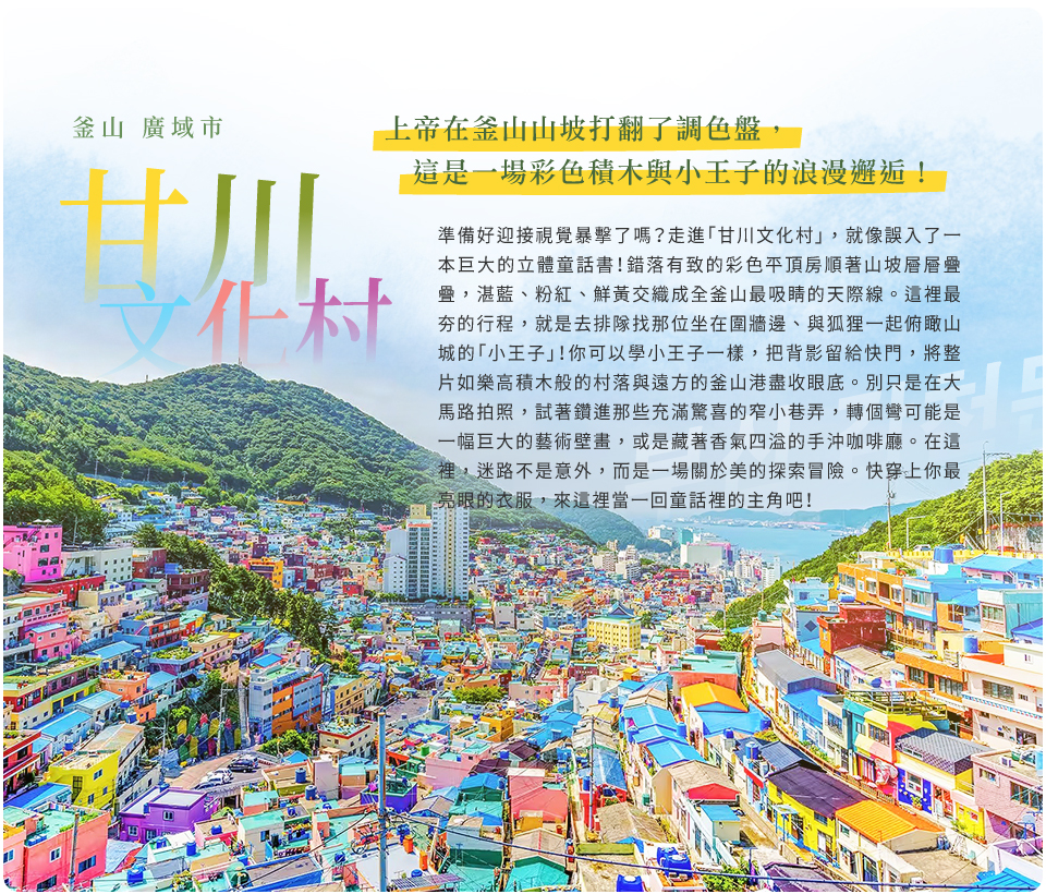 釜山最經典、最具代表性的彩色山城,依山而建的房屋被漆上繽紛色彩,巷弄階梯間充滿壁畫、藝術裝置與可愛拍照點。這裡最知名的打卡地標就是【小王子與狐狸】,坐在山城邊緣眺望釜山港景,彷彿走進童話故事場景,怎麼拍都超出片。站上高處俯瞰整個村落,色彩層層堆疊如同童話世界般夢幻,是釜山絕對不能錯過的必訪景點之一。。
