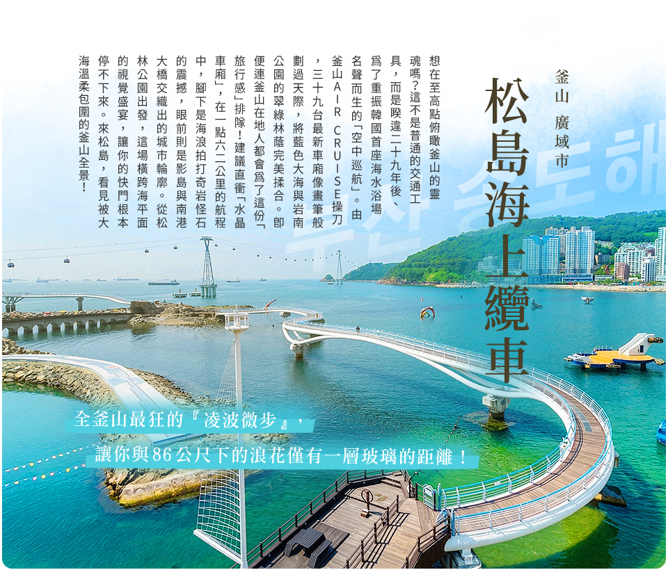 松島雲橋是超人氣拍照景點,走在橋上可以近距離欣賞海景與周圍景色,既浪漫又充滿旅遊感。非常適合情侶、家庭、朋友合照留念,也是釜山海岸行程中不可錯過的一站。